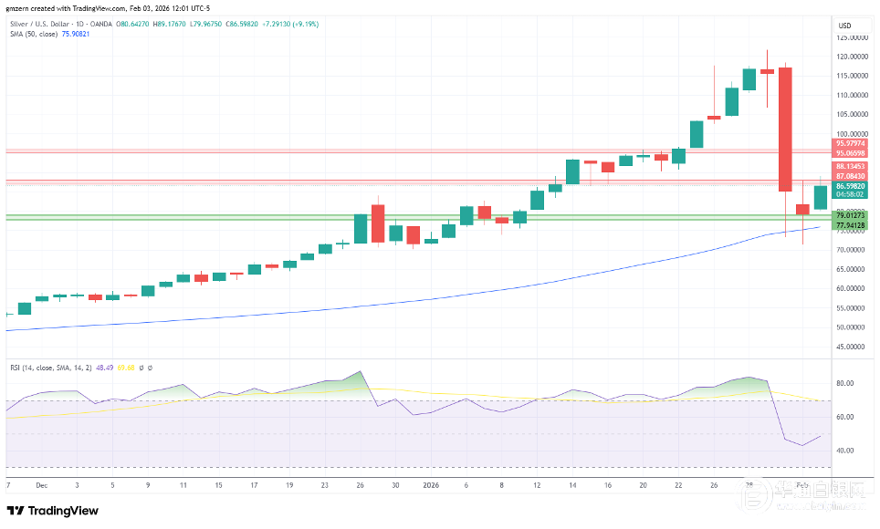 如果银价成功突破88.00美元,那么接下来或将触及下一阻力位95.00美元至96.00美元区间。