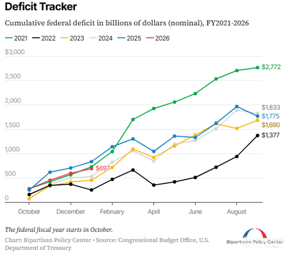 截至2026财年1月底,美国联邦政府的预算赤字为6000亿美元。与上一财年同期相比,这一数字减少了五分之一,这得益于更高的所得税收入以及特朗普在重返白宫后的第一年动用紧急权力实施《国际紧急经济权力法》所规定的关税措施。