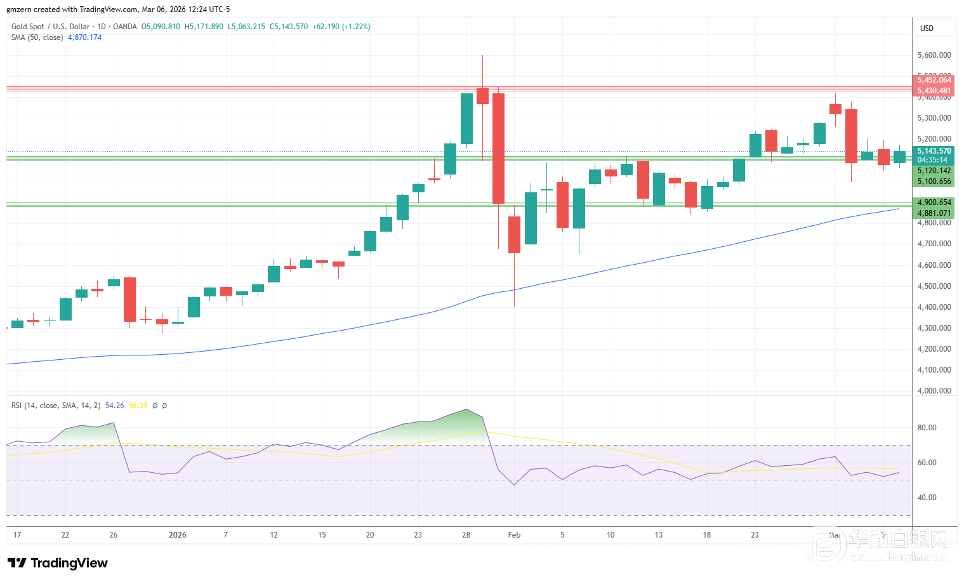 支撑方面,若黄金价格跌破5100美元,将为测试下一个支撑位4880-4900美元铺平道路。