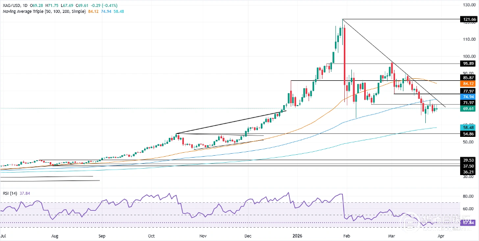 短期内的走势略显看跌,白银上方受到100日移动均线74.11美元的压制,下方则受到3月23日的波动低点61.02美元的限制。