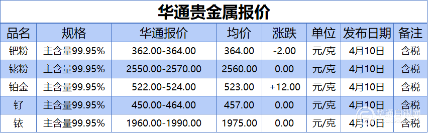 华通白银网 4月10日讯:钯粉、铑粉、铂金、钌、铱报价