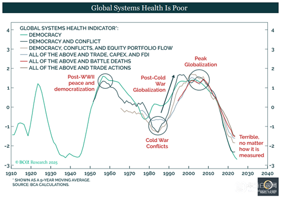”黄金正在为这种摆脱美国霸权和全球化峰值的结构性转变定价。”Nicky Shiels称。她展示了一张投资研究公司BCA的全球系统健康指标图表,从长期来看,该指标与过去一个世纪的黄金价格图表呈反向关系。