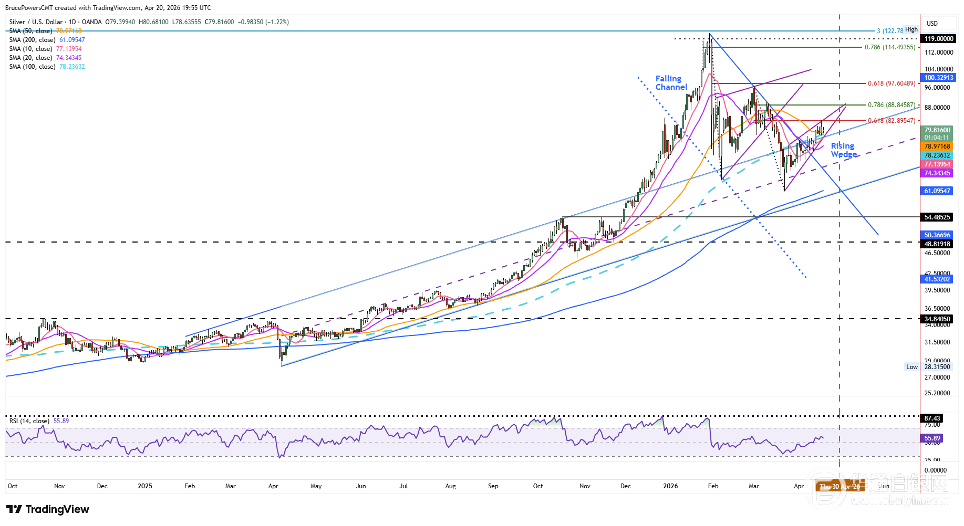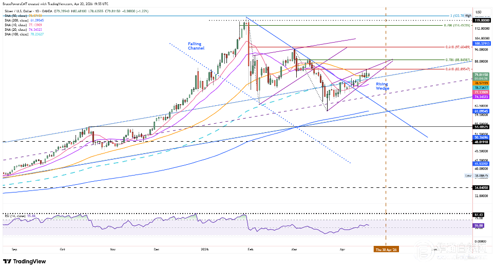 白银日线图上形成了一个小型上升楔形形态,该形态的顶部对应着接近78.6%斐波那契回撤位的潜在阻力位,即88.85美元。值得注意的是,白银可能会朝着更高的目标继续上涨,同时仍处于楔形形态的范围内。