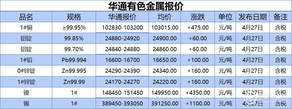 华通白银网 4月27日讯:1#、铝锭(99.85%)、铝锭(99.70%)、1#铅、1#、0#锌、镍、锡报价