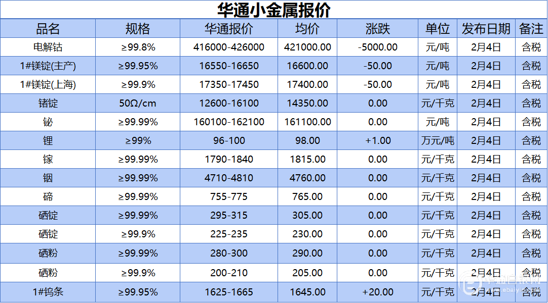 华通小金属,小金属报价,华通报价,小金属价格,金属价格行情