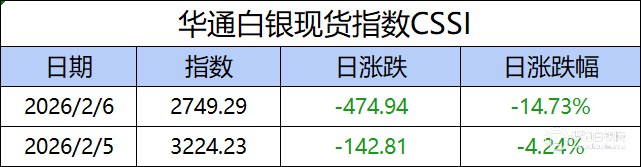 华通白银现货指数CSSI走势日报,今日指数2749.29,日涨跌-474.94,日涨跌幅-14.73%