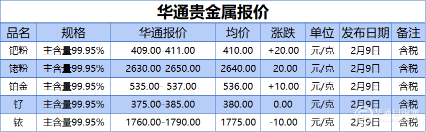 华通白银网 2月9日讯:钯粉、铑粉、铂金、钌、铱报价