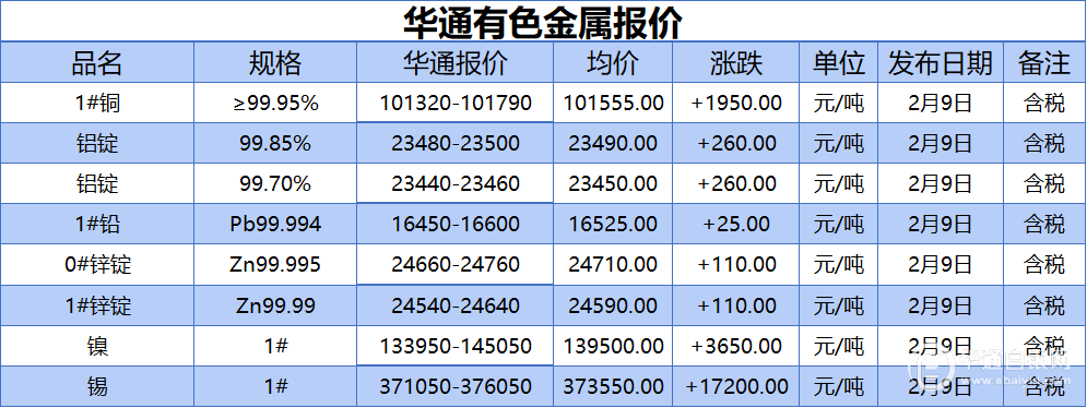 华通白银网 2月9日讯:1#铜、铝锭(99.85%)、铝锭(99.70%)、1#铅、1#锌、0#锌、镍、锡报价