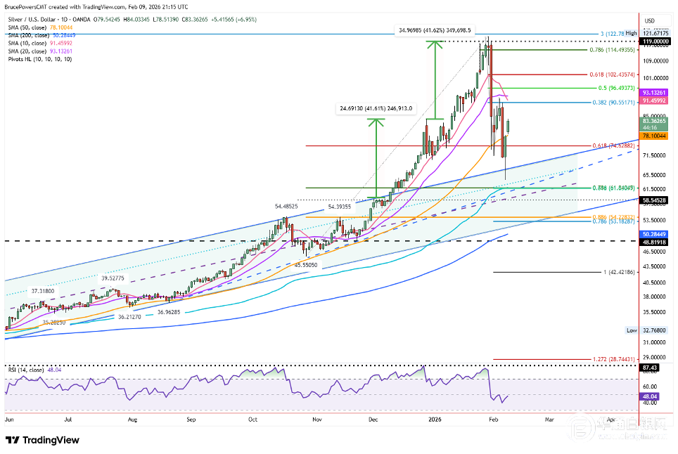 上周白银价格在64.06美元的回调低点测试了上升趋势通道上沿的支撑区域。价格从通道上沿反弹,表明这一前期长期阻力位已转化为支撑位,这同样是看涨信号。但该信号仍需进一步确认,需观察上周五低点是否能持续形成更高的波动低点。若以1月高点121.67美元为基准测算,白银在此低点累计下跌57.61美元,跌幅达47.4%。