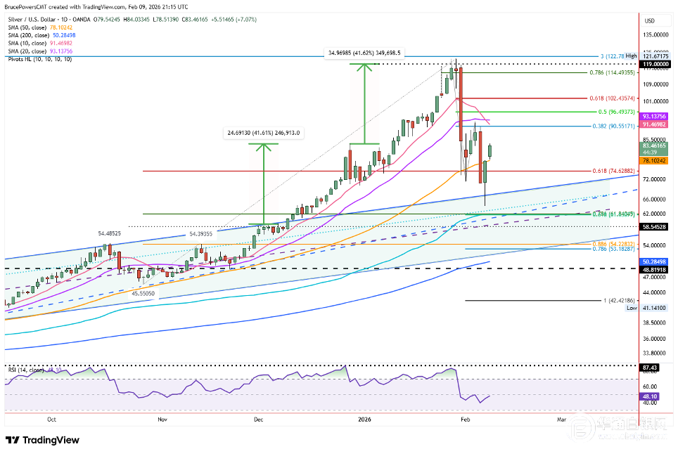 若白银日线收盘价能站稳50日均线(当前位于78.11美元),则视为对50日均线的有效突破。这将确认反弹力度的稳固,并为冲击更高目标价位奠定基础。鉴于此前价格从高点急剧回落,白银趋势的重建可能需要一定时间。这意味着短期波动仍将持续,市场进入横盘整理阶段亦不足为奇。