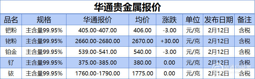 华通白银网 2月12日讯:钯粉、铑粉、铂金、钌、铱报价