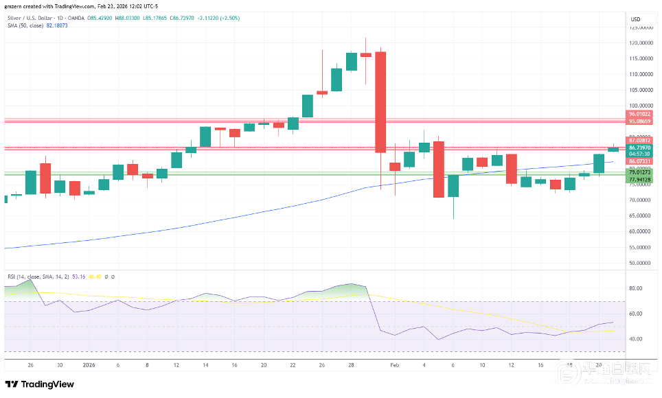 目前,白银正试图在86.00-87.00美元阻力位上方企稳。如果白银能够稳定在87.00美元上方,则将向下一个阻力位95.00-96.00美元迈进。