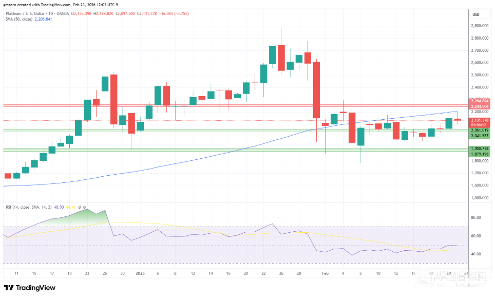 从技术层面来看,铂金未能在2205美元上方突破50日移动均线,随后回落至2150美元以下。如果铂金继续低于2150美元,则将朝着最近的支撑位2040至2060美元区间移动。