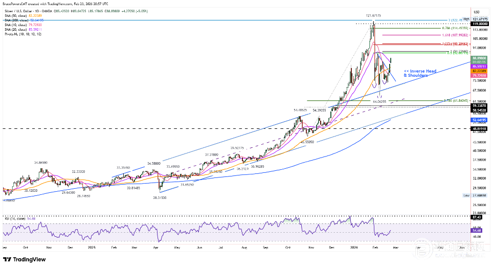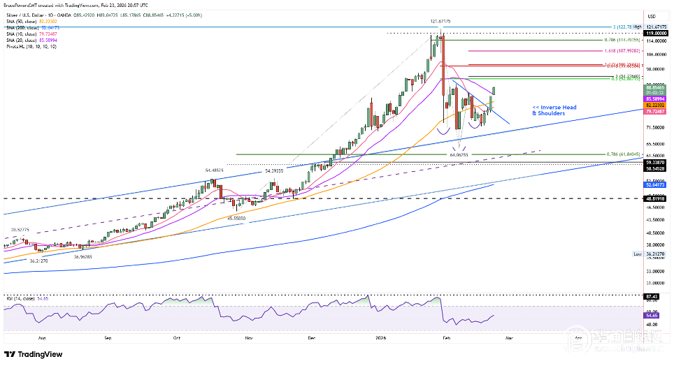 (现货白银日线图出现头肩底反转形态看涨突破)