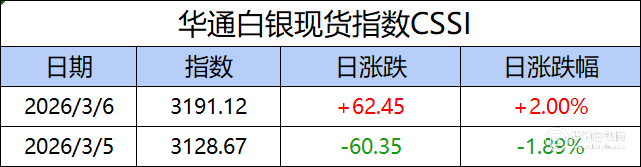 华通白银现货指数CSSI走势日报,今日指数3191.12,日涨跌+62.45,日涨跌幅+2.00%