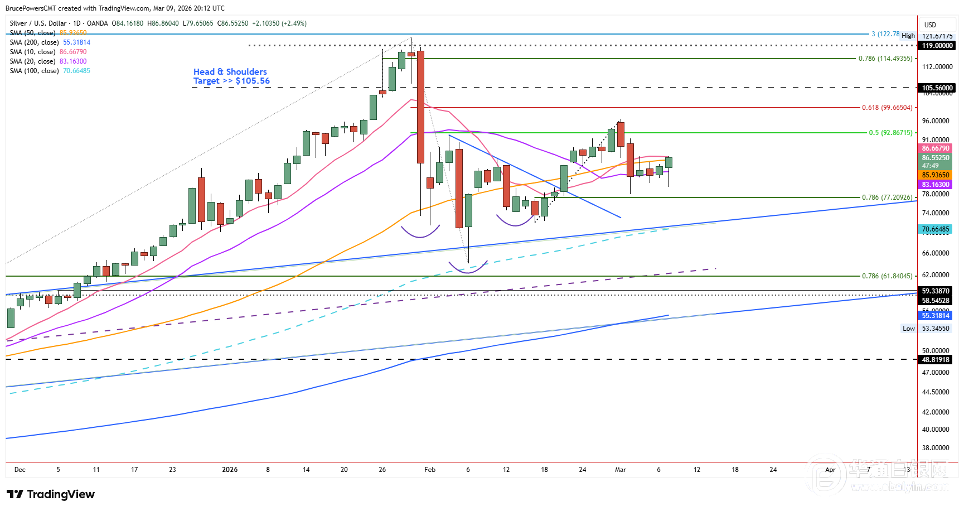 若头肩底形态保持有效,白银需站稳于71.98美元的更高回调低点(即头肩形态的右肩)上方。从趋势结构来看,需收复上周二高点91.35美元,方能确认日线级别的看涨反转。然而,周一K线已呈现看涨的外扩区间形态。若收盘价突破上周五高点84.98美元,则构成单日反转信号;而若收盘价站上周四高点86.84美元,将是更为强劲的看涨指示。