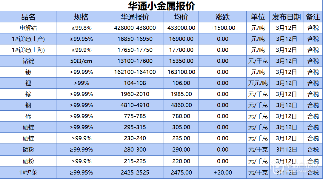 华通白银网 3月12日讯:电解、1#镁锭(生产)、1#镁锭(上海)、锗锭、铋、锂、镓、铟、碲、硒锭(99.99%)、硒锭(99.9%)、硒粉、硒粉(99.9%)、1#钨条报价