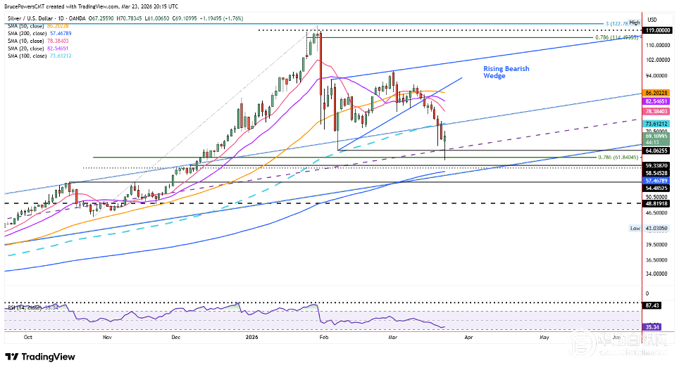 (现货白银日线图显示持续下跌态势)