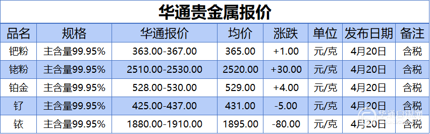华通白银网 4月20日讯:钯粉、铑粉、铂金、钌、铱报价
