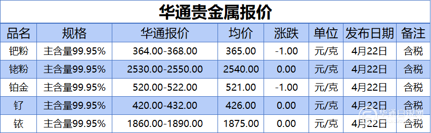 华通白银网 4月22日讯:钯粉、铑粉、铂金、钌、铱报价