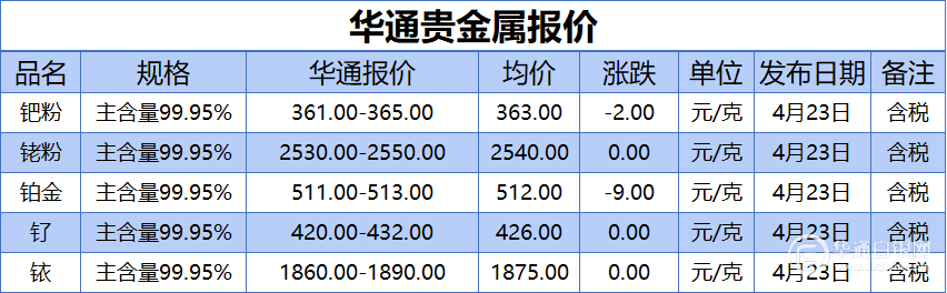 华通白银网 4月23日讯:钯粉铑粉、铂金、钌、铱报价