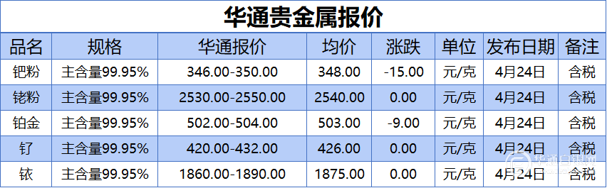 华通白银网 4月24日讯:钯粉、铑粉、铂金、钌、铱报价
