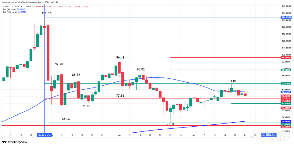 【华通白银网4月24日讯】银价跌破50日移动均线,美元和收益率施压