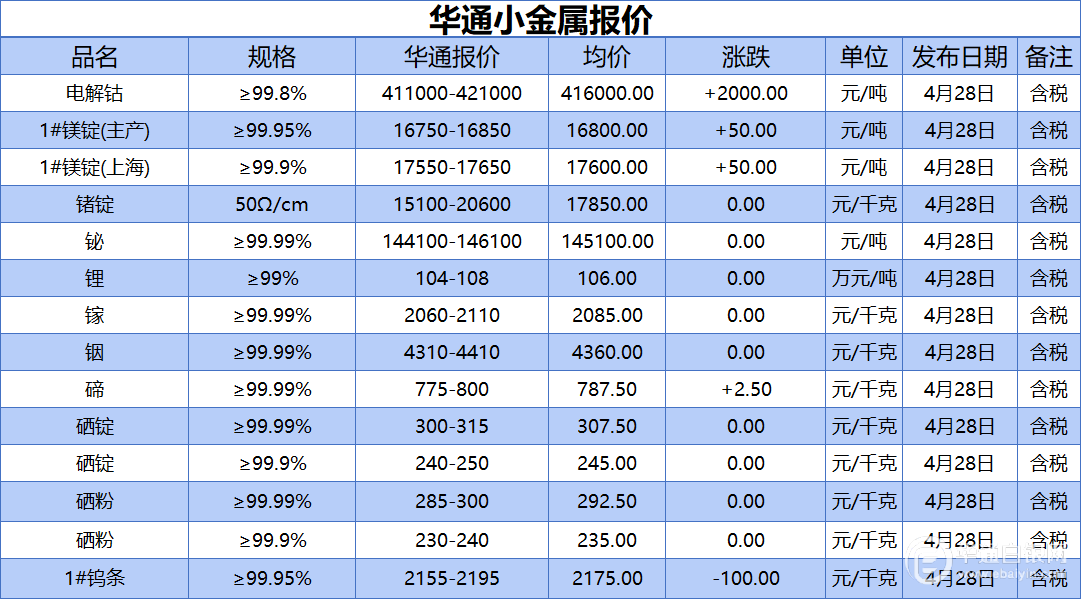 华通白银网 4月28日讯:电解钴、1#镁锭(生产)、1#镁锭(上海)、锗锭、铋、锂、镓、铟、碲、硒锭(99.99%)、硒锭(99.9%)、硒粉、硒粉(99.9%)、1#钨条报价