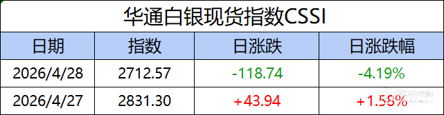 华通白银现货指数CSSI走势日报,今日指数2712.57,日涨跌-118.74,日涨跌幅-4.19%
