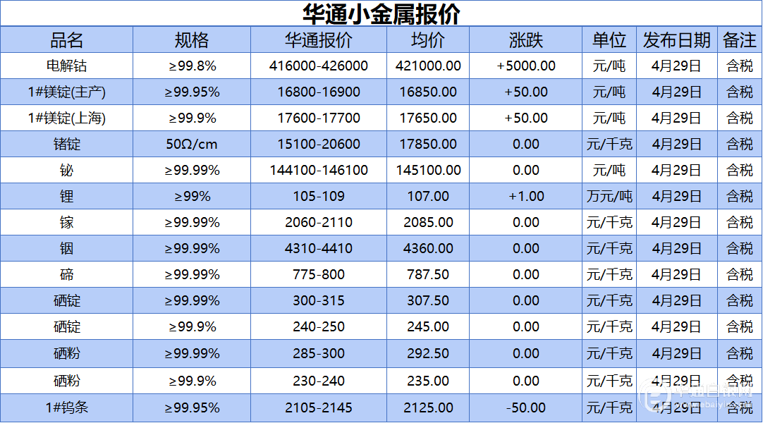 华通白银网 4月29日讯:电解钴、1#镁锭(生产)、1#镁锭(上海)、锗锭、铋、锂、镓、铟、碲、硒锭(99.99%)、硒锭(99.9%)、硒粉、硒粉(99.9%)、1#钨条报价