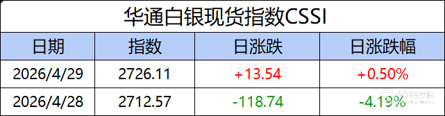 华通白银现货指数CSSI走势日报,今日指数2726.11,日涨跌+13.54,日涨跌幅+0.50%