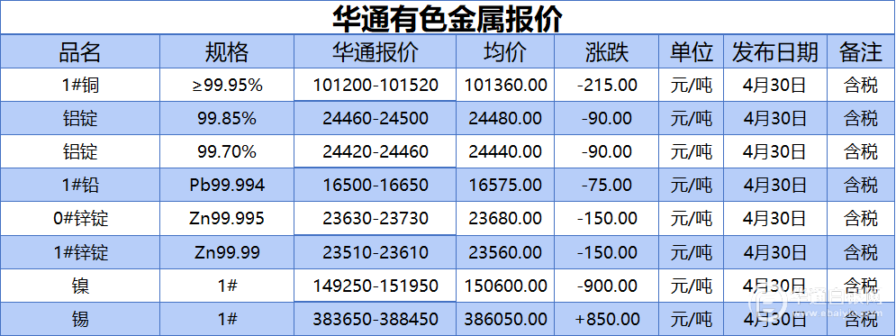 华通白银网 4月30日讯:1#铜、铝锭(99.85%)、铝锭(99.70%)、1#铅、1#锌、0#锌、镍、锡报价